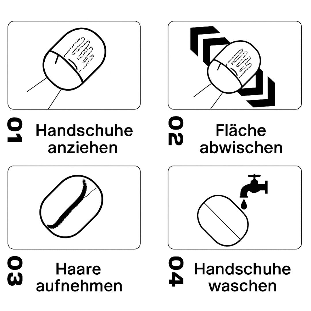 ✔ Effektiv & schnell – Dank elektrostatischem Effekt bleiben die Haare sofort am Handschuh haften. Kein Verteilen, kein Aufwand.